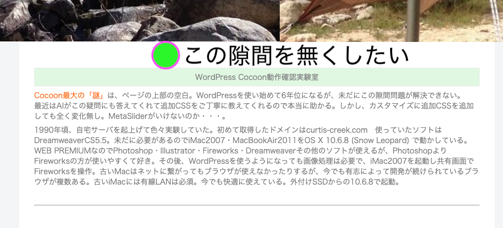 Cocoon最大の「謎」は、ページの上部の空白。WordPressを使い始めて6年位になるが、未だにこの隙間問題が解決できない。